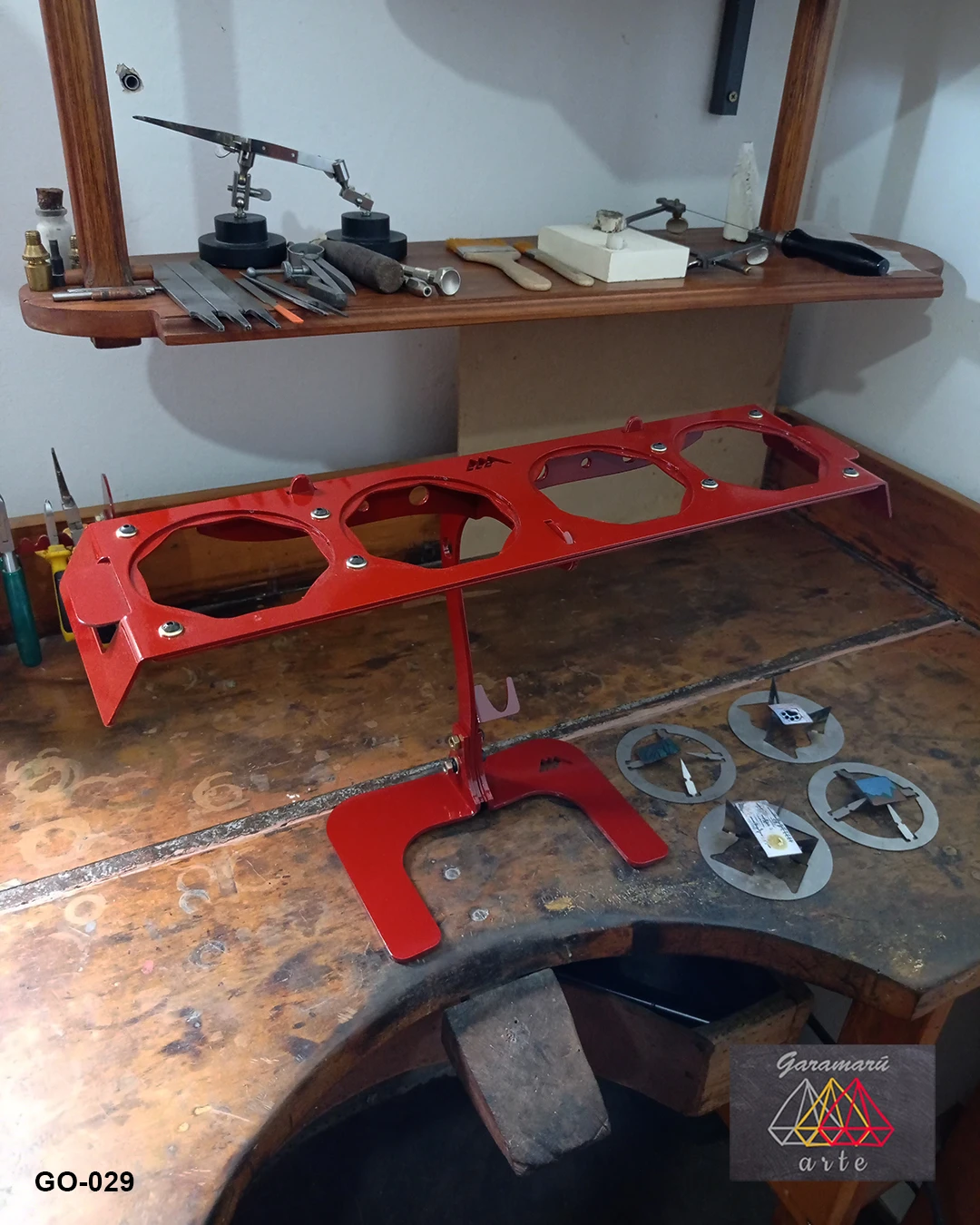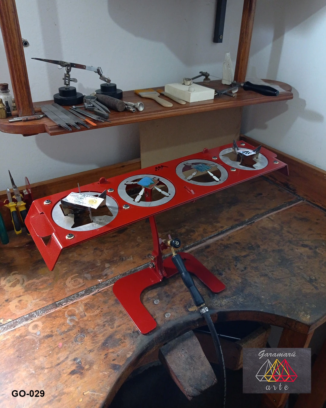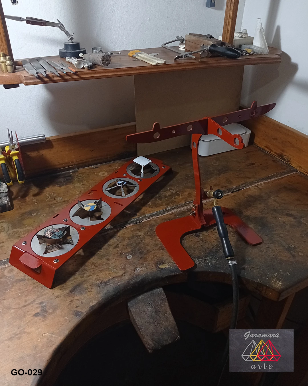 Diseñada para facilitar trabajos en serie, esta base permite retirar la estación de cocción junto con todas las chapas esmaltadas si fuera necesario. Es compatible con los soportes para esmaltar y contra esmaltar con soplete GO-034, GO-035 y GO-036, garantizando un proceso más eficiente y versátil.